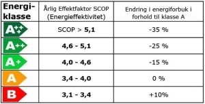 Som du kan se, skal varmepumpen have mindst 5,1 i SCOP-værdi for at opnå en A +++-mærkning. Både vores nyeste Flagship-model og Heatchange-modellerne er mærket A +++. SCOP er en betegnelse for effektfaktoren om året, dvs. hvor effektiv en bestemt varmepumpe vil være ved et givent varmebehov i løbet af et år.
