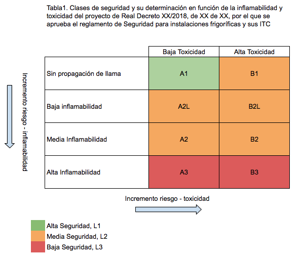 El RSIF clasifica a los refrigerantes en función de dos criterios, uno de ellos la inflamabilidad. Con la adaptación del reglamento a la norma europea se crea la categoría 2L, que se caracteriza por ser de baja inflamabilidad. El segundo criterio es la toxicidad, que no se modifica, y que diferencia entre el grupo A de baja toxicidad y el grupo B de alta toxicidad. En la imagen inferior se observa cómo quedaría la nueva clasificación.