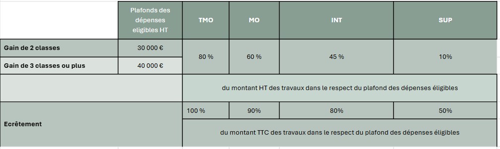 Depuis le 30 septembre 2025,le dispositif concerne exclusivement les logements classées E, F et G avec un montant total des dépenses éligibles de 30 000 euros pour les projets permettant un gain de deux classes énergétique DPE et de 40 000 euros pour les projets permettant un gain de 3 classes ou plus.