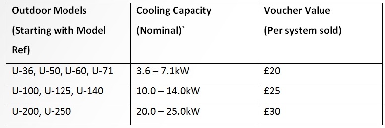 Air conditioning installers that purchase the Panasonic PACi (commercial splits) systems can receive Love2Shop vouchers of £20, £25 and £30 depending on models and cooling capacities of units purchased (see table below for exact models). The scheme is running from 1st July to 30th September 2017 on purchases of every PACi system sold this summer.