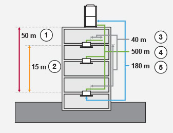 Adattabile a edifici di diverse tipologie e dimensioni. Lunghezza tubazioni effettiva: 180 m. Lunghezza massima tubazioni: 500 m.