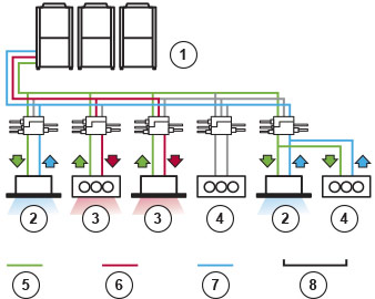 Le unità esterne della serie ECOi MF2 a tre tubi possiedono un controllo on-demand che utilizza la tecnologia ad inverter, grazie al quale il consumo energetico può essere ridotto su tre diversi livelli in modo da fornire le prestazioni ottimali in base alle regolazioni (2) impostate. Questo accorgimento permette di ridurre il consumo elettrico annuale e i conseguenti costi di approvvigionamento dell’energia elettrica pur assicurando il massimo comfort.