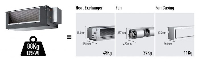 Innendørsdelen kan splittes opp i tre deler; varmeveksler, viftedel og viftehus. Det gjør installasjonen enklere og raskere, og gir god fleksibilitet i hvordan anlegget kan installeres. Derfor passer modellen spesielt godt for ettermonteringsprosjekter, i tillegg til små lokaler og rom.