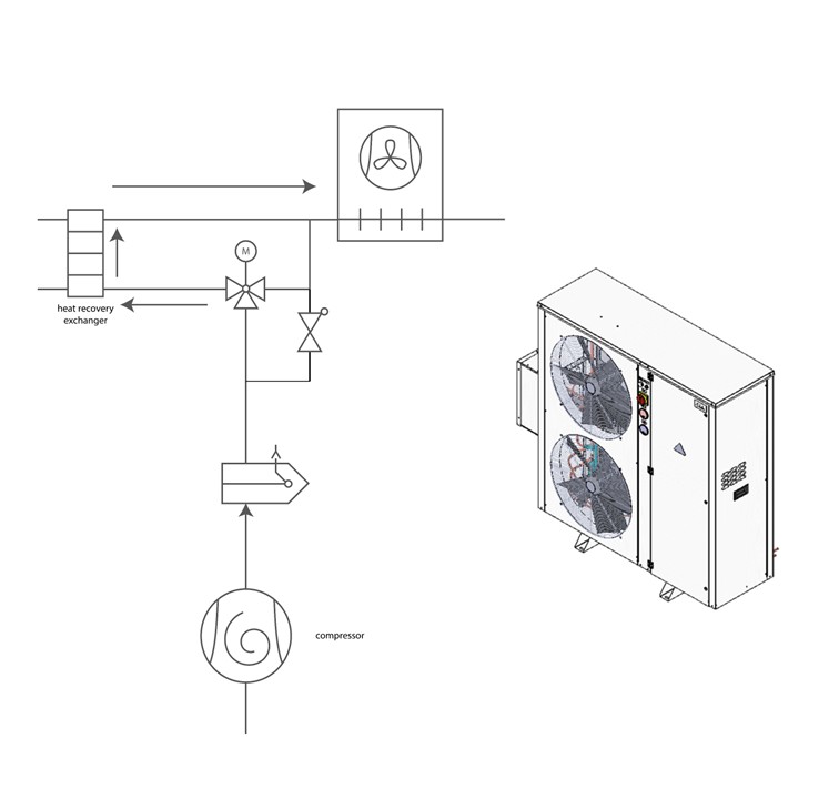 The heat recovery system can reduce the overall energy costs as an optional function of the primary cooling operation. It also increases the efficiency of a system at high ambient temperatures. Nowadays, it has become standard in European supermarkets. It should be used everywhere when possible.
