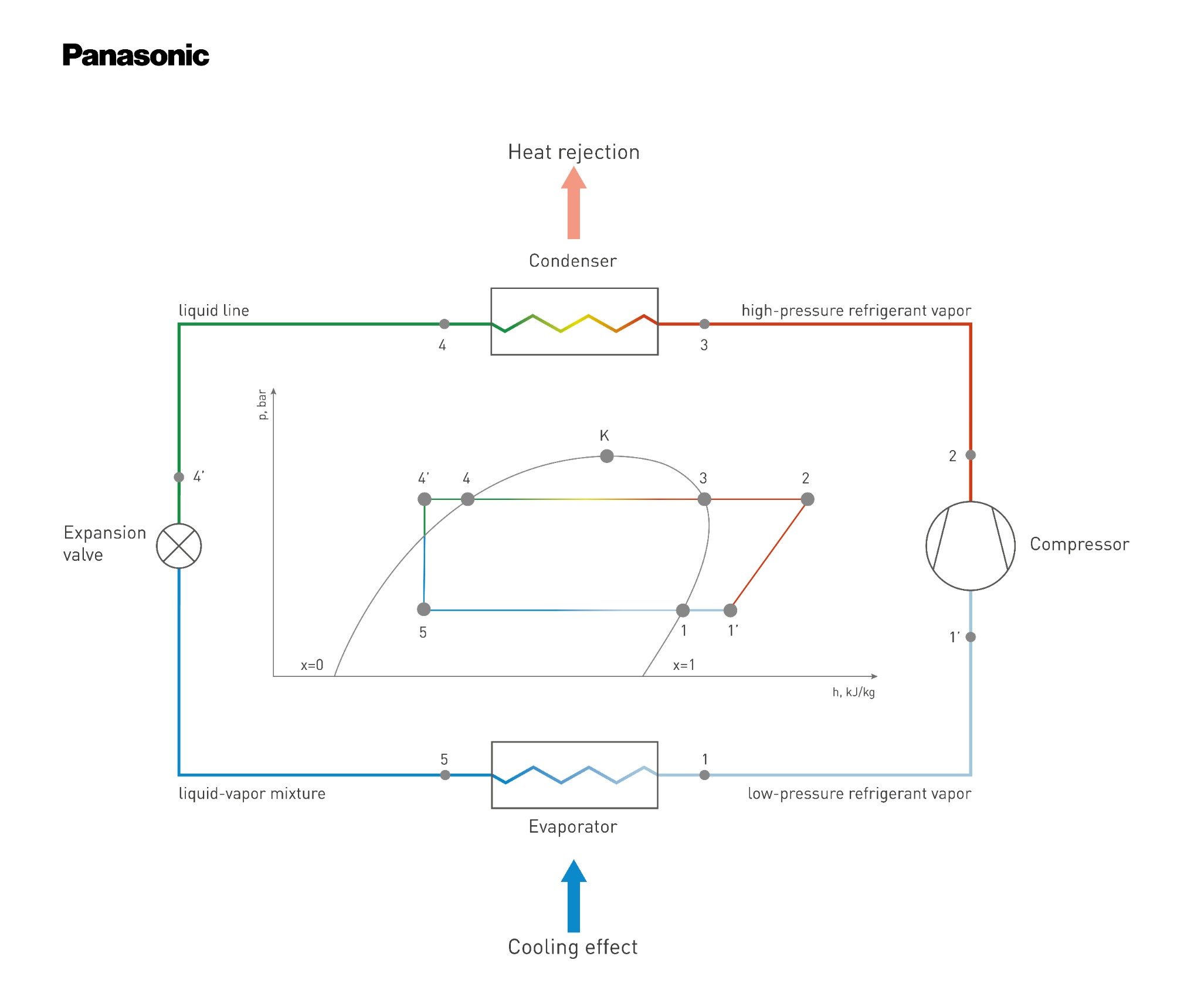 It is usually recommended to make the liquid refrigerant slightly subcooled in practice. The subcooling process takes place from point 4 to 4’ and ensures that liquid refrigerant enters the expansion valve. With the subcooling, we also increase the specific cooling capacity (the segment between points 5 and 1 on the chart).